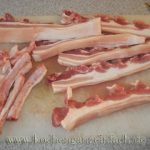 Statt der Schweinebauch scheiben hatte ich ca. 1 kg Schweinebauch mit Knochen, der noch ausgelöst werden musste. Also Knochen und Schwarte entfernen und in ca. 2 cm dicke scheiben schneiden. Daraus dann das Fleisch in Würfel schneiden und in einem gut gesalzenen Wassertopf die Würfel etwa 20 min garen.